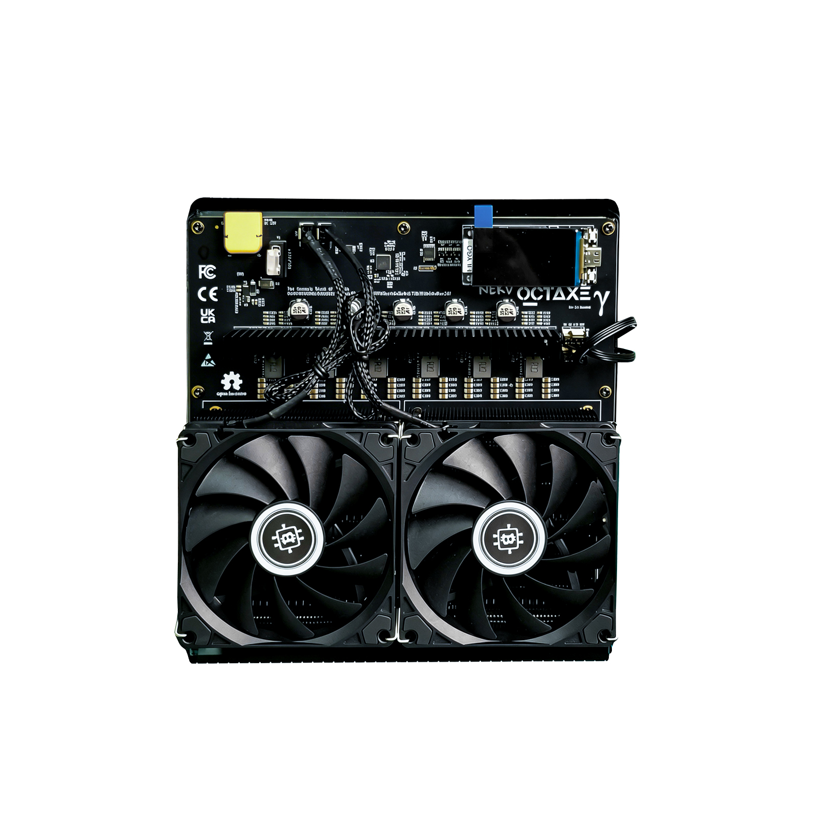 NerdMiner NerdOCTAxe, optimized for the SHA-256 mining algorithm from NerdMiner, comes with a maximum hash rate of 9.6TH/s for a power consumption of 160W. With an efficient air cooling system, NerdOCTAxe dissipates heat effectively, preventing machine overheating while aiding an excellent energy efficiency of 16.67 j/Th.